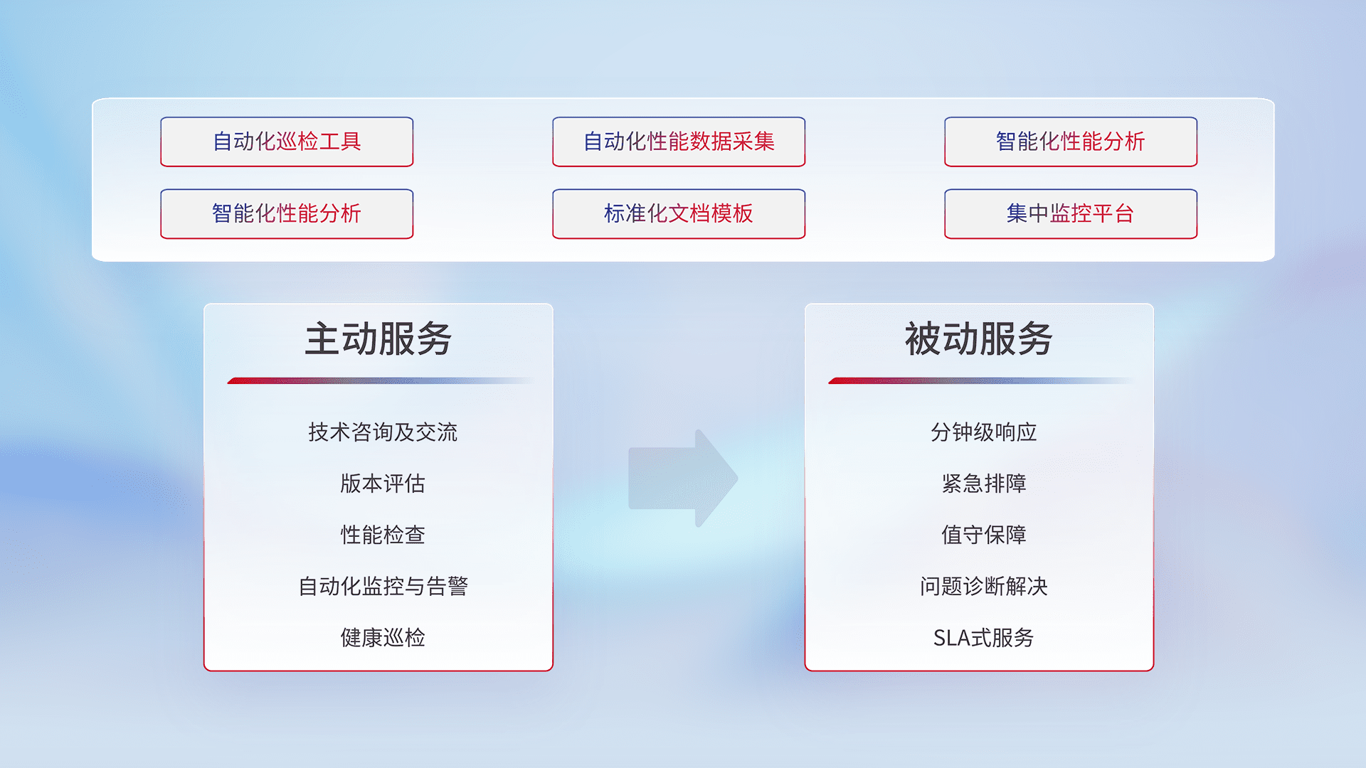 智能化工具和标准化文档,,,,保障服务质量,,,,提供主动服务(包含技术咨询、、版本评估、、性能检查、、自动化监控与告警、、健康巡检)和被动服务包含(分钟级响应、、、、紧急排障、、值守保障、、、问题诊断解决、、、、SLA服务)。。。